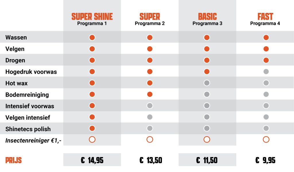 WashEasy staat voor snel, schoon en voordelig autowassen. Hieronder een schema van alle wasprogramma’s bij WashEasy in Spijkenisse en Vierpolders.